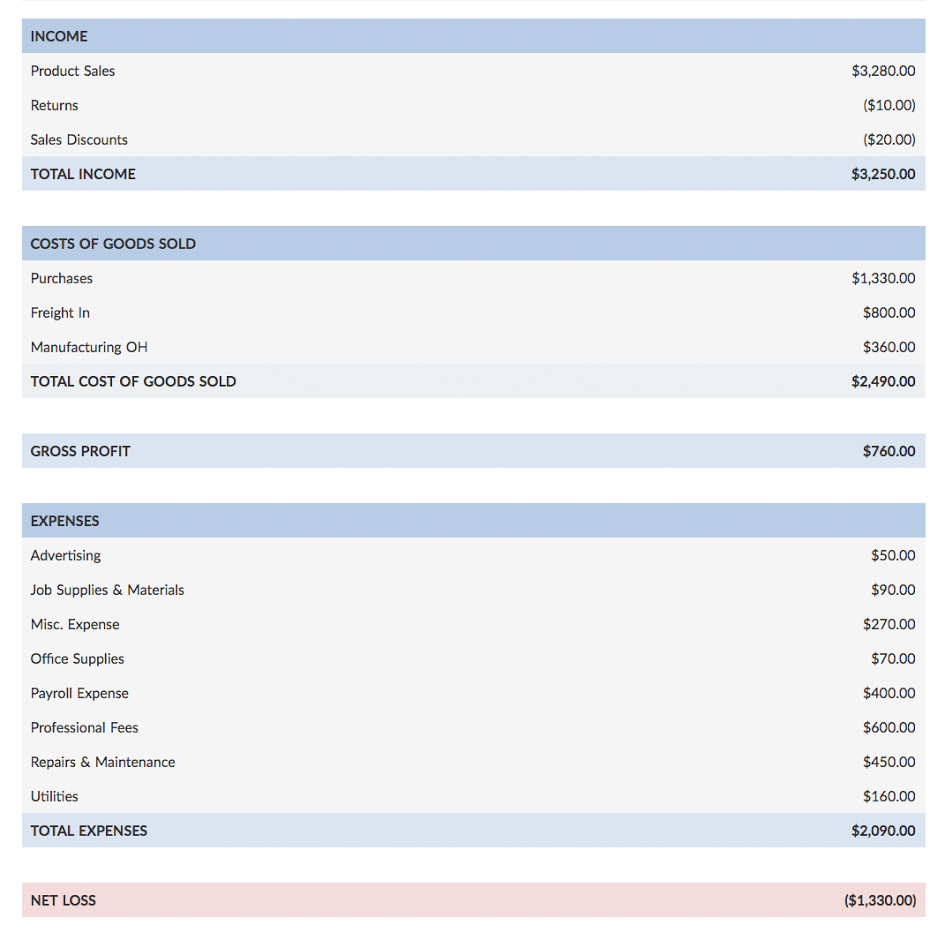 利润和损失声明由类别制定,以向您展示收入,销售的货物费用,毛利润、费用、税费和净损益。